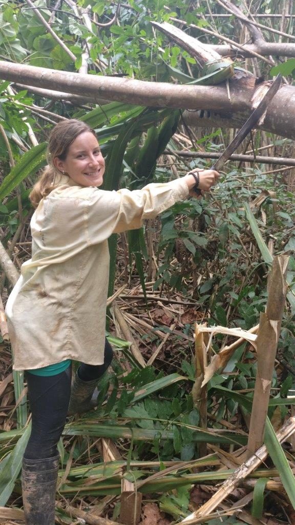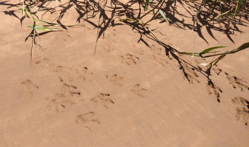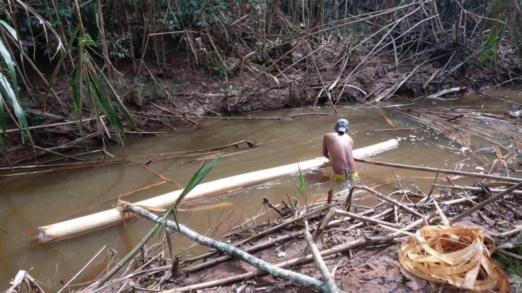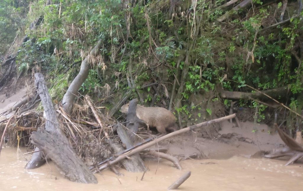 Para este dia, tínhamos outra “grande” missão pela frente, a construção de uma jangada que nos levaria no dia seguinte até ao acampamento “Escorpion Travel”. Quando estávamos a tomar o pequeno almoço, reparámos que a chuva do dia anterior tinha feito subir bastante o rio. Além disso, reparámos que no sítio onde nos tínhamos banhado no dia anterior, estava um jacaré bem grande a “passear”. Depois, foi tempo de arrumar tudo e continuar caminho à beira do rio para encontrar as árvores balsa. Estas árvores necessitam de um ano para crescer e são as ideias para construir uma jangada, devido à sua boa flutuação. Quando encontrámos as árvores, tivemos que cortá-las com as machetes, tirar a casca e por fim, começar a construir a jangada. Até parece fácil, mas não foi! Para unir os troncos das árvores, utilizámos a fibra que está colada à casca. Enquanto estávamos a cortar a madeira, conseguimos ver um grande grupo de macacos “martin” a saltarem de árvore em árvore. Quando acabámos de construir a jangada, seguimos rio abaixo até encontrarmos uma boa “praia” para passar a noite. Depois de encontrarmos a “praia”, foi tempo de tirar tudo da jangada e fazer um abrigo para dormir. Como já estava a anoitecer, cortámos bambus para fazer a base do abrigo e depois utilizámos uma cobertura de plástico para o “teto”. Com o abrigo já pronto, fomos procurar madeira para fazer lume. Para o jantar, o Lázaro preparou um “majadito” com carne seca e ficou uma delícia. Neste local, encontrámos mais uma vez muitas pegadas de jaguar.