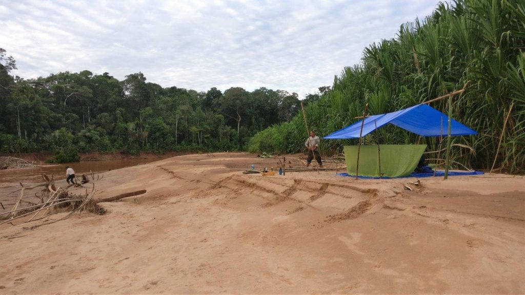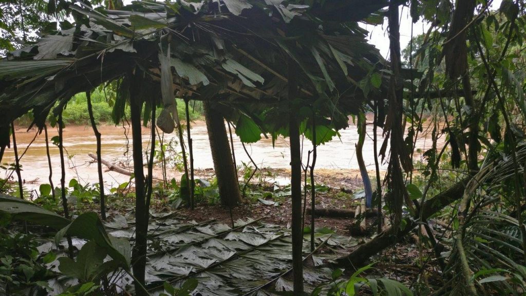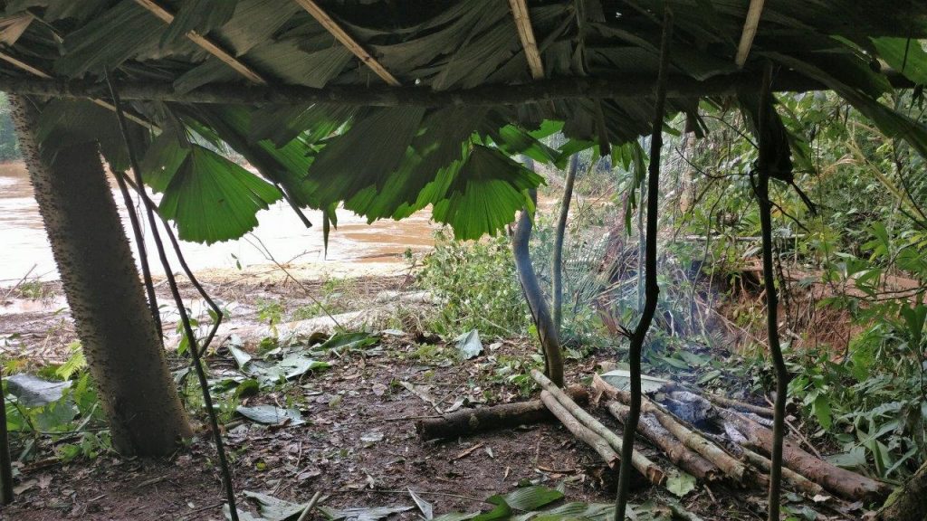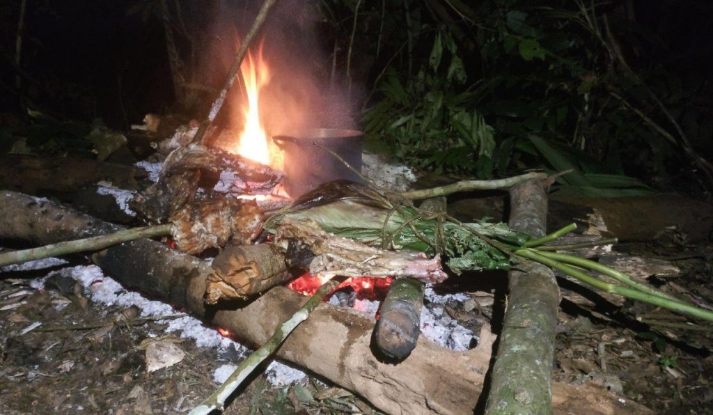 Durante a noite choveu bastante e quando acordámos ainda chovia um pouco. Para o pequeno almoço comemos carne seca (conhecida por charque) grelhada na fogueira acompanhada de farinha de plátano. Como ia ser um dia bastante desgastante em termos físicos (e também psicológicos) fizemos uma “bola” com algumas folhas de coca, o que nos acompanhou durante algumas horas. No início sentes o lado da boca onde se encontra a “bola” de coca um pouco dormente. A verdade é que durante o dia sentimo-nos com bastante energia e saciados, mesmo com o calor, a humidade e com o pouco que comemos. O Lázaro também nos ensinou a construiu copos a partir de bambu. Arrumámos tudo e começámos mais uma caminhada pela selva. Durante a caminhada, enquanto estávamos a seguir as pegadas de um tapir, vimos uma tartaruga terrestre bem escondida. Mais à frente, voltámos a parar para apanhar umas minhocas, que iriam servir como isco para a pesca. Mais um pouco de caminhada por entre esta floresta densa e chegámos a um sítio bom (perto do rio) para acampar, mas ainda era um pouco cedo, por isso decidimos continuar. Por onde queríamos ir, a floresta estava cada vez mais densa e não estava a ser nada fácil avançar. Tentámos várias vezes, mesmo com a ajuda do machete (facão) mas era quase impossível. Cerca de uma hora depois, decidimos voltar para o sítio que tínhamos visto antes. A nossa missão para esta tarde era construir um abrigo para passar a noite e para isso, tínhamos de encontrar as árvores certas, “copas” e as respetivas folhas. Antes de começarmos, o Lázaro preparou-nos uma bebida feita com cacau e rapadura da cana de açúcar, uma bebida bem energética. Quando terminámos a construção do abrigo e fizemos uma fogueira, ainda fomos tomar um banho no rio. O problema foi quando saímos, fomos “devorados” por moscas da areia (sandflies). Depois de secos, fomos tentar pescar. Enquanto estávamos na conversa, já com o isco dentro de água, a linha começa a fazer imensa força. O Lázaro e o João ficaram todos entusiasmados, pois o que era tinha de ser grande. Depois de alguma luta, conseguimos pescar um peixe-gato, com cerca de 10 kg (pensamos nós). Estávamos todos contentes, pois já tínhamos jantar assegurado. Depois de preparar o peixe, foi hora de o colocar a grelhar num espeto e outra parte dentro de uma folha de palmeira. Para acompanhar, nada melhor que arroz. Quando estávamos quase prontos para comer, começou a fazer bastante vento. Quando faz muito vento é melhor ir para algum lugar sem árvores, pois pode ser perigoso. Nós fomos para a “praia”, perto do rio. Quando o vento acalmou, regressámos para o acampamento e regalámo-nos com o jantar. Estava uma delícia e deu-nos uma grande motivação para o dia seguinte.