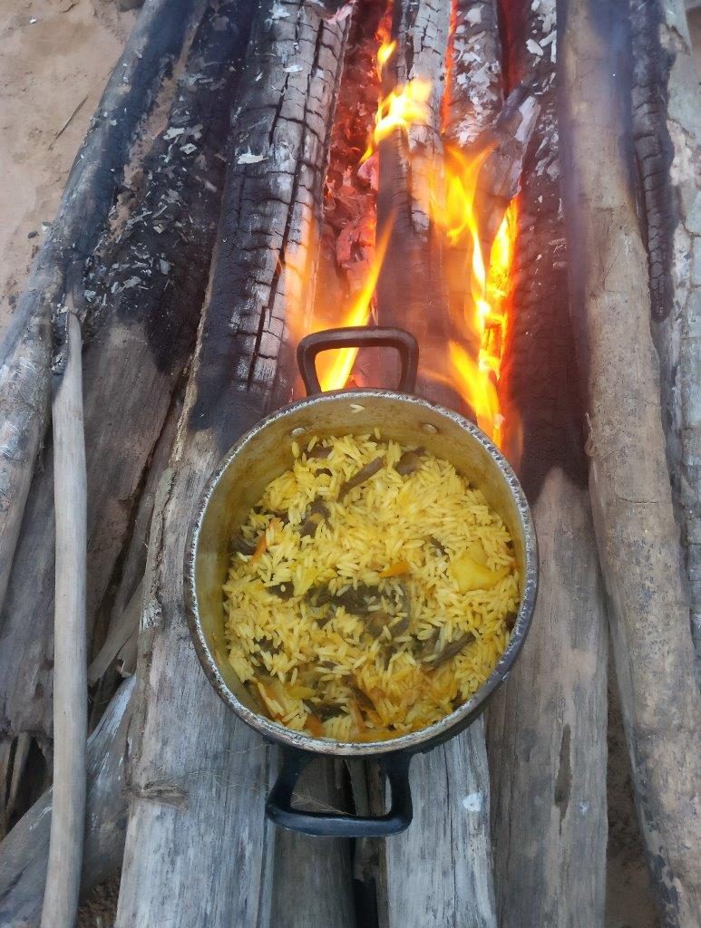 Pelo caminho, ainda fez uma mochila para a Carina, utilizando a folha de palmeira “majo”. Depois, colocámos dentro da mochila alguns frutos “motacú” para levar para o acampamento. Durante o passeio, vimos mais uma vez árvores enormes, “matapalo”. Para não variar, voltámos a ver pegadas de jaguar, mas não vimos nenhum. Quando chegámos ao acampamento, fomos fazer artesanato com algumas sementes que tínhamos apanhado nos últimos dias: “solulo”, “soliman”, lágrimas de Maria e “motacú”. Com estas sementes, o Lázaro ajudou-nos a fazer dois colares e dois anéis ?. Durante o jantar, conhecermos o William e a Manon, com quem íamos no dia seguinte para as pampas.